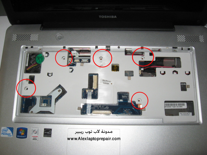 نقوم الأن بازالة المسامير الموجودة أسفل الكيبورد والموضحه بالصورة حتى يتسنى لنا رفع الغطاء العلوى للجهاز مع إزالة جميع الكيبُل التى نشاهدها والخاصه بزر الباور والتاتش باد ,, إلخ
