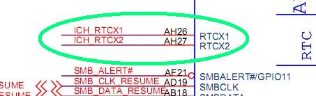فى نفس الوقت التى تمت فيه تغذية دائرة RTC بفولت البطاريه يتم تغذية كريستالة البور 32 كيلو هرتز بنفس فولت تغذية دائرة RTC استعدادا لتغذية الشيب بالتردد اللازم له وهنا كريستالة الباور فى حالة الشيب الانتل تتغذى فى حدود أقل من 1 فولت وكما نلاحظ من الرسم نقاط اتصال الكريستاله بالشيب الفرعى
