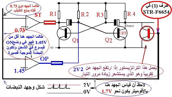  الرابط العلوي يكون في الوضع ON فيمرر الجهد الذي من المفترض وصوله للرابط يمرره أرضاً فيؤدي ذلك إلى نقص في مركبة الجهد DC على الطرف (1) والتي تحمل إشارة فتح وغلق الموسفت مما يزيد في زمن إغلاق المذبذب فيؤدي ذلك لضعف قدرة الخرج والهدف من ذلك توفير الطاقة